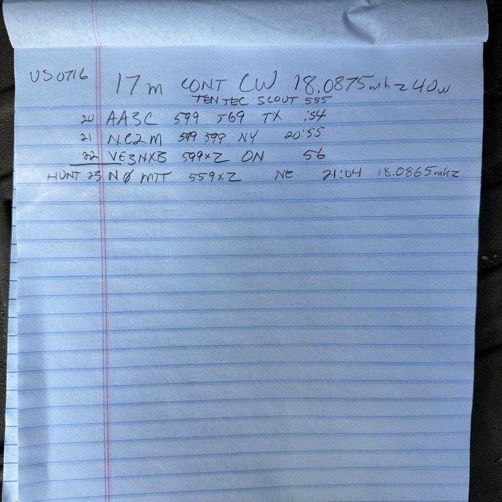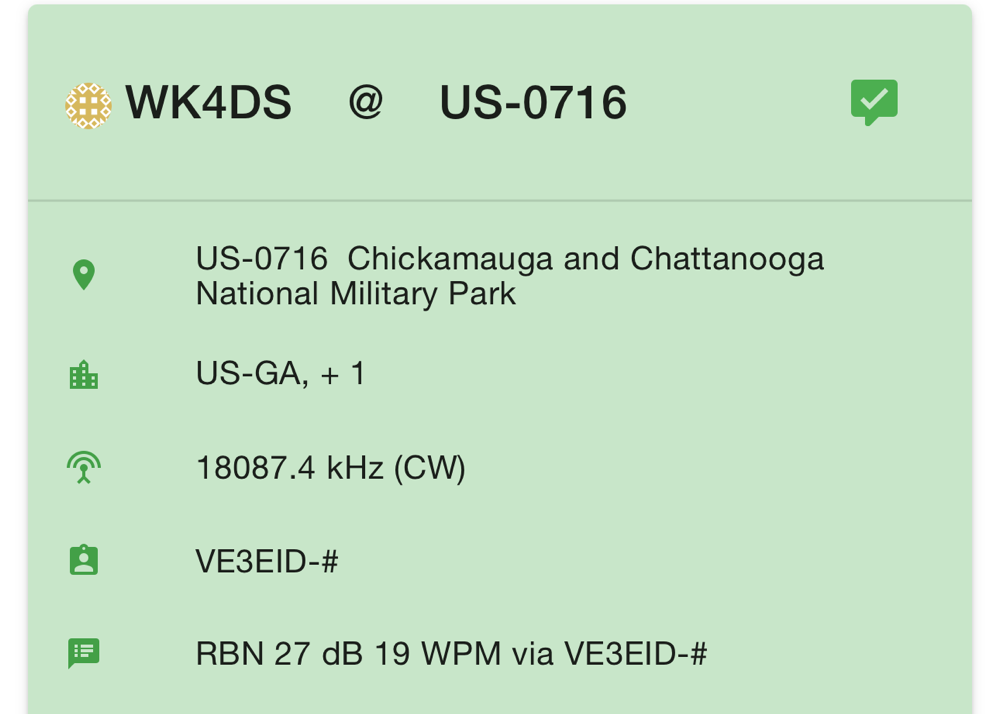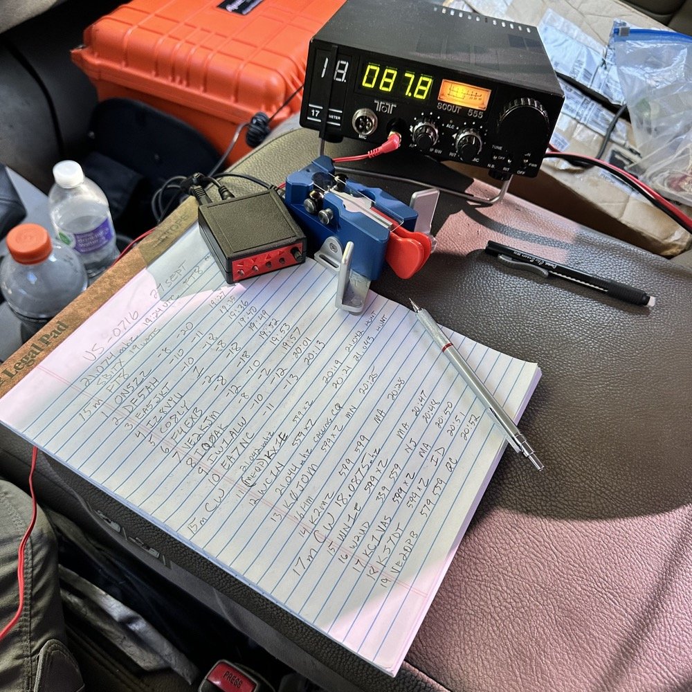 17 meters was coming in strong. That is a great signal report for a portable radio running 40 watts into a compromise antenna on a car… This was coming to me from Canada too, which told me the band was really open and there just wasn’t a lot of people on the radio on 17 on this day. FT8 was going strong, but there were only a few CW stations at the time I was there.