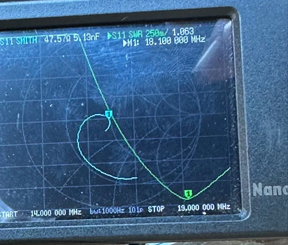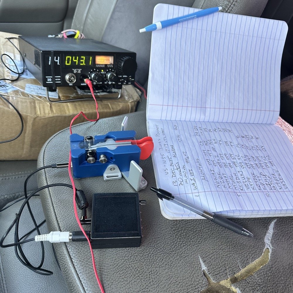 To give you some perspective, the SWR meter on the Scout moved to the rest position when I keyer the transmitter… This was as good as it gets. I can hear you antenna nerds already in the comments section, “ a dummy load has perfect SWR too” and yes, your right, this is different though. This is a tuned antenna system so the RF has somewhere to go instead of making heat. There are no transformers or termination resistors, just coax, a radiator and some radials. I just adjust the radials and the vertical till they show what you see above on the smith chart. 13nF capacitive could probably be fixed by moving the radials a little more closer to vertical below the antenna, but like I said, it was just not worth the squeeze at this point so I hopped in the truck and got back on the air. These antennas just plain work. Just look at the logbook for proof.