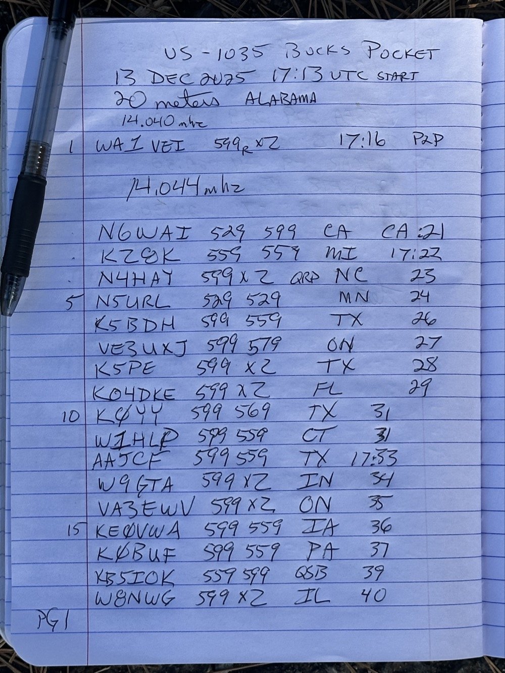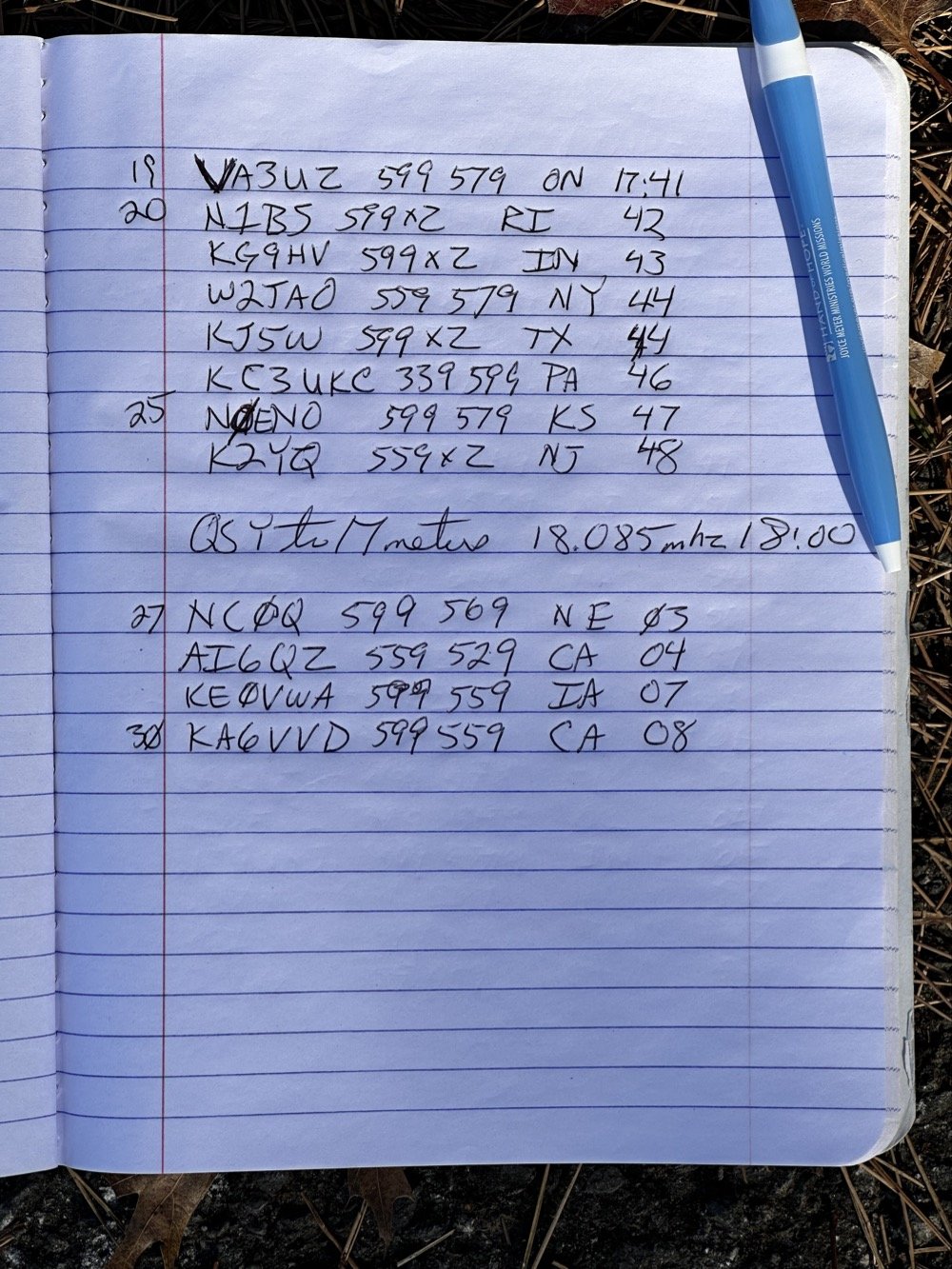 Getting 30 calls in the log while enjoying a view like this is what POTA is all about. To get you out of the house and into the world a little and I love it. IF you see your name in the log below and want a QSL card from me, just mail me a card and I will be happy to reply with one.
