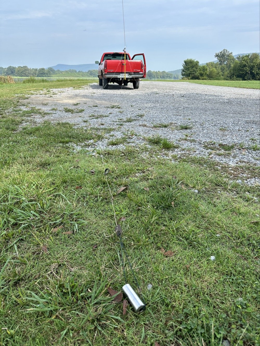 I started with a really long radial which was actually my 40 meter radial set (normally connected at the center) ran full length out to a weight in the grass. The radial is over 30’ long like this. By the time I had taken this photo, I had “tuned” the antenna which includes moving the radial around to adjust impedance on the system. That is why it is not taught in the photo below.