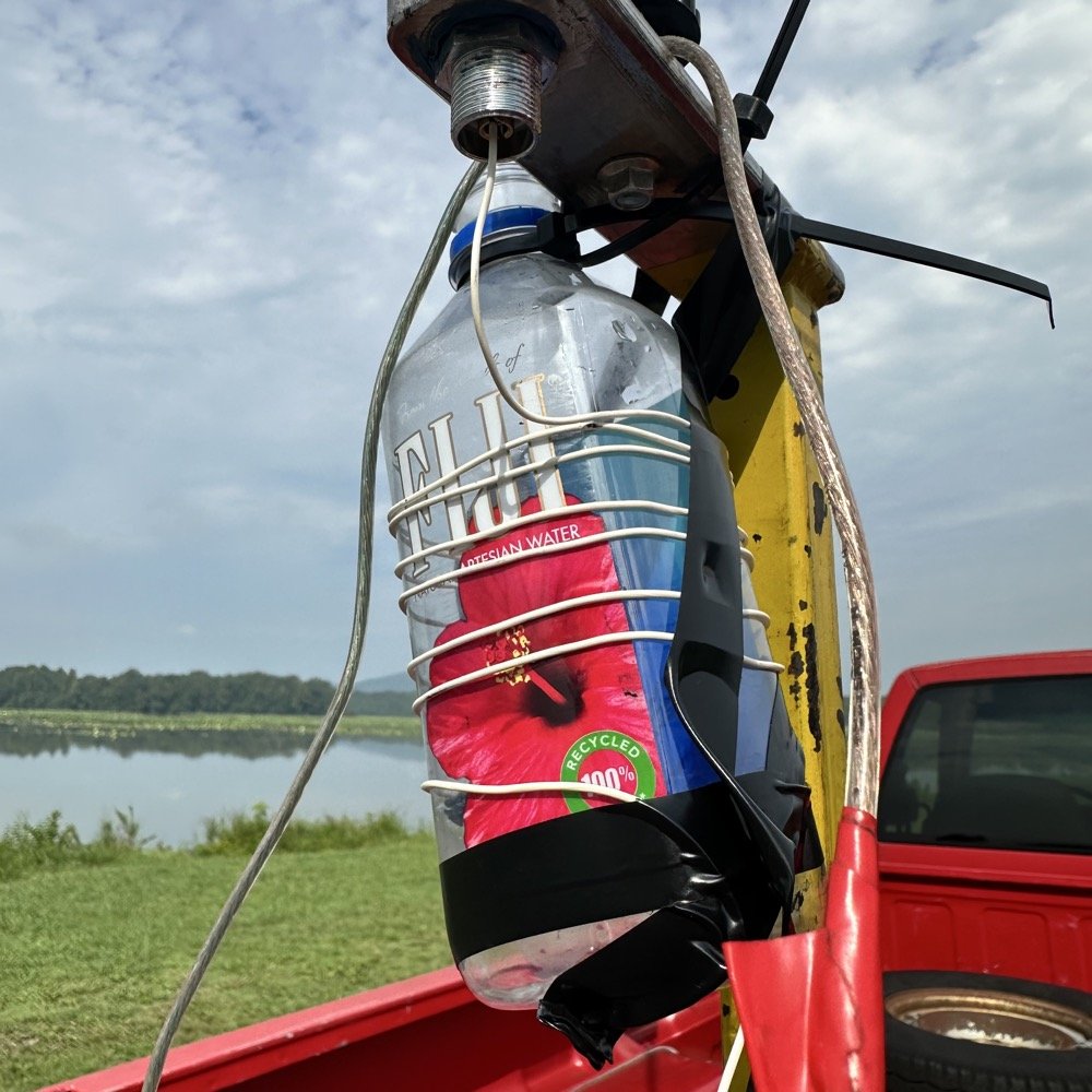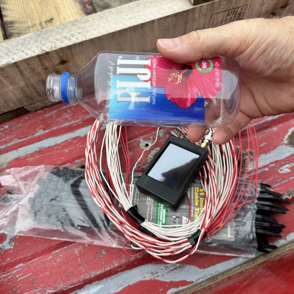 The next thing I had to do what figure out how to make the antenna at least “appear” longer to the radio so I could trick it into thinking it was really a 40 meter resonant antenna. I gathered some supplies as you can see below and started cobbling together a load coil to put at the base of the antenna. As you can see I had the nanoVNA ( a critical part of this side project), I also rounded up a roll of electrical tape before I was done, to hold the coil together. The wire is from the 10$ antenna video I did recently on our YouTube channel and I keep zip ties in the truck all the time. All I needed past this was a coil form and I found it with this used water bottle I had in the truck.