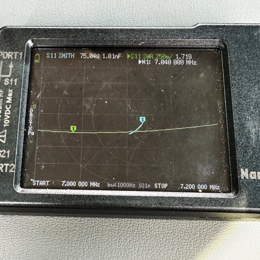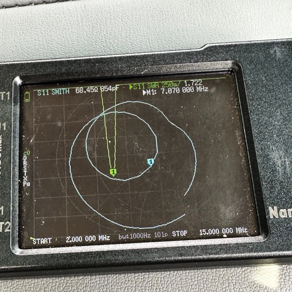 The wire from the load coil is simply stripped bare and folded over to make a “spring” like pin to stick up into the base socket of the vertical whip. This actually worked better than I thought it would. I simply kept removing coils from the water bottle form till I got close, then I started spreading them out to move the frequency up into the 40 meter band space. I think when they were compressed together they were resonant at about 6.55mhz or so. I could tell it was working but I didn’t want to cut too much and have to start over so I went pretty slow to get to this point. This landed me on 7.070mhz just like I wanted as you can see below. Notice as well that you can see the SWR plot is 1.722:1 which is completely usable in my book.