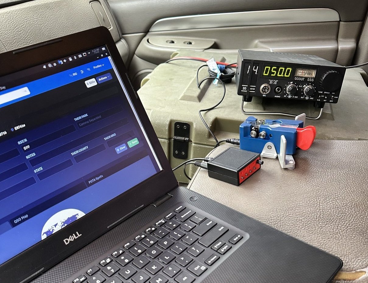 Paired with the Ten Tec Scout is my Begali Traveler key and my Hamgadgets Picokeyer. This combination is a joy to use for POTA and I look forward to using it when I can. The Traveler is a great key and I really like how the fold out feet are designed to protect the paddle blades when the key is stored. As you can see, I got the case for the Ten Tec Argonaut 5 out and used it for a table to hold up the radio and get it out of my way. This permitted me the space to be able to use my new-to-me Dell Inspiron 14” computer I bought for logging POTA ops with. This tiny little machine works great and can get me by in a pinch for photo and video editing too, even if it struggles a little with those tasks. I have about 160$ in this machine and I figure that isn’t too bad for a great little logging machine.